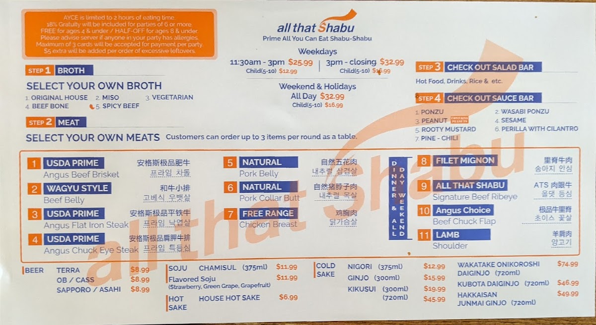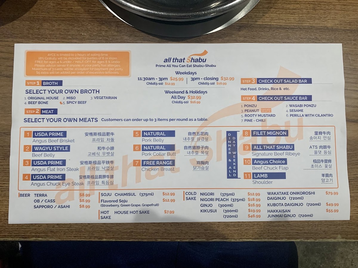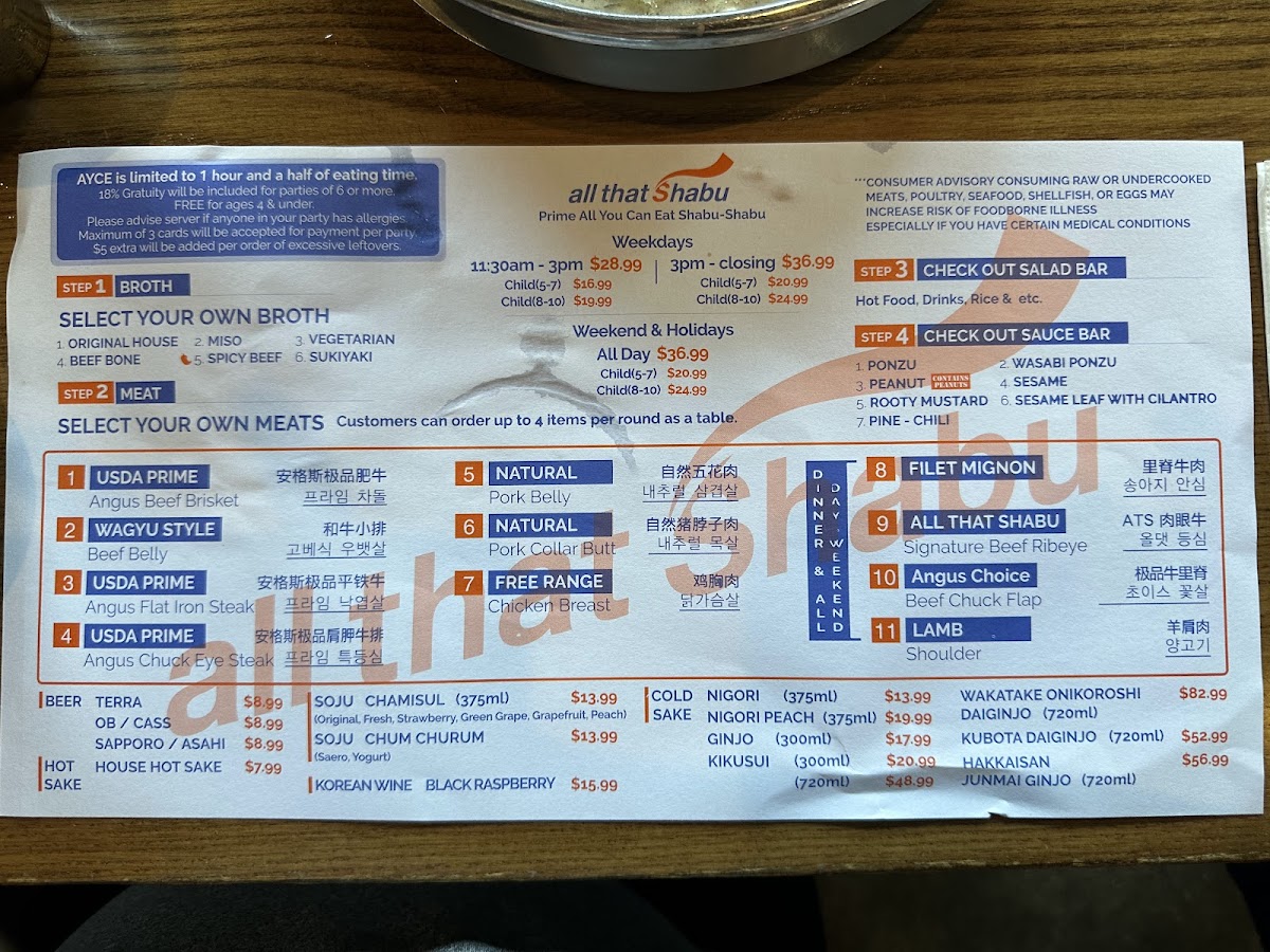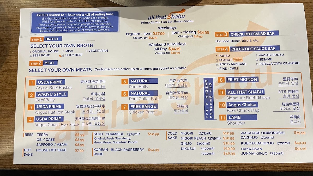 Attentive service meat quality was 4.8 of 5 but the people look after you the selection is slim but it should be like that. I believe the weekday dinner which is when I went had 10 items so still a lot. USDA prime meat cuts. Buffet style for the seafood side dishes salad and sauce bar. They had some hot food from the kitchen like korean fried wings too. Refill your own drinks and ice cream and dessert. 6 different broths. Great value for 26 bucks.